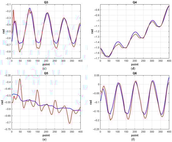 Graphs of changes in generalized coordinates when the manipulator moves along a 3D spiral (the correctional NN): (a) q1; (b) q2; (c) q3; (d) q4; (e) q5; (f) q6.