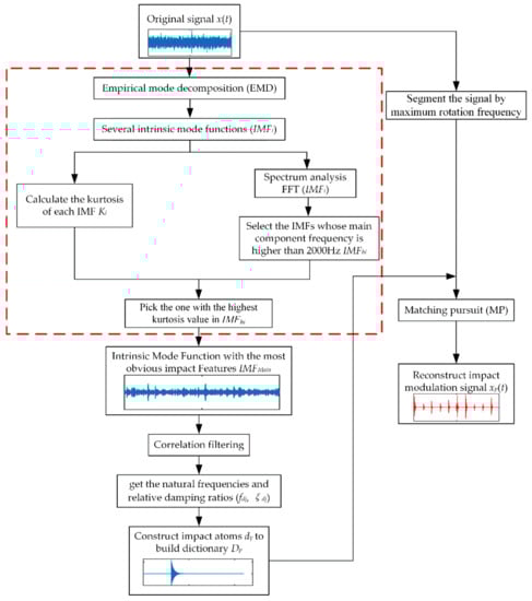 In order to diagnose the gear local fault, an impact feature extraction method based on EMD and sparse decomposition is proposed in this section. EMD is employed to separate high-frequency resonance components from meshing harmonics and part of noise. This effectively alleviates the problem that sparse decomposition is susceptible to irrelevant components. The transient impact component is extracted from original signal rather than a certain IMF, which effectively avoids possible modal aliasing or end effects affecting the results. The flowchart of the proposed impact feature extraction method for gear local fault diagnosis is shown in Figure 1.