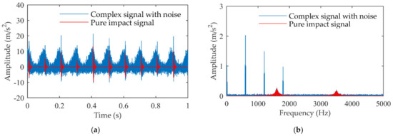 To highlight the superiority of the proposed method, the traditional sparse decomposition is used to process the same simulation signal. Specifically, the natural frequency and relative damping ratio are directly identified from original signal rather than MIMF. The extracted impact component is shown in Figure 5. There are a lot of interference components appearing in the time domain except for transient impact signal as shown in Figure 5a. It leads to difficulty to identify the exact impact interval. Moreover, a large number of meshing harmonic components are visible in the amplitude spectrum. The model parameters of the dominant harmonic components are wrongly identified and added to the impact dictionary resulting in the poor extraction results.