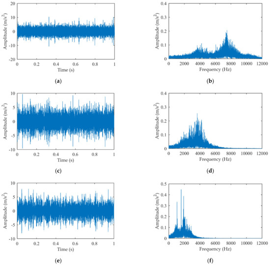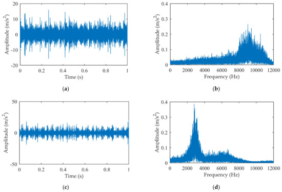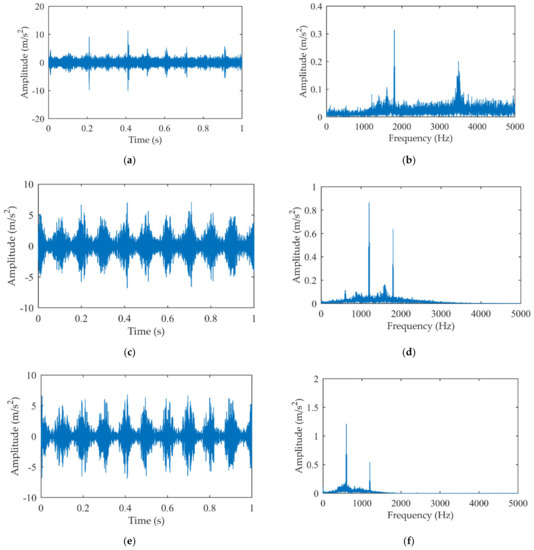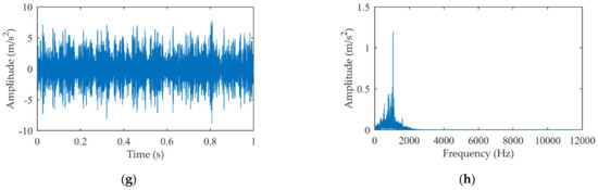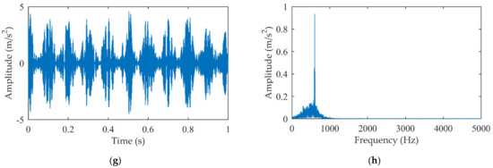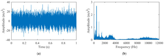 In order to highlight the effectiveness of the proposed method, the acceleration signal collected on the bearing house of output shaft (sensor 2 in Figure 13b, which is far from the faulty gear) is analyzed. The measured vibration acceleration signal and its amplitude spectrum are shown in Figure 14. In this case, the fault impact component is submerged in noise and the meshing frequencies are dominant in the spectrum.