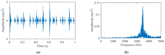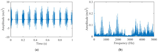 The measured acceleration signal of the five-speed transmission experiment: (a) Time domain signal; (b) Amplitude spectrum.