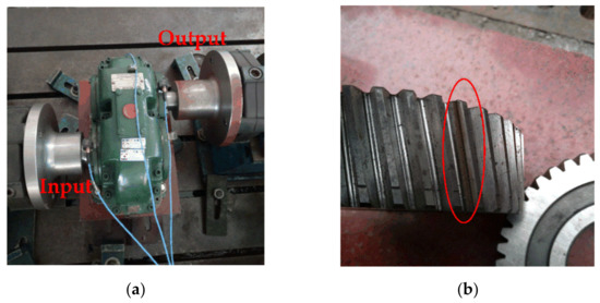 The single-stage gearbox test bench: (a) The single-stage gearbox; (b) The local fault gear with pitting.