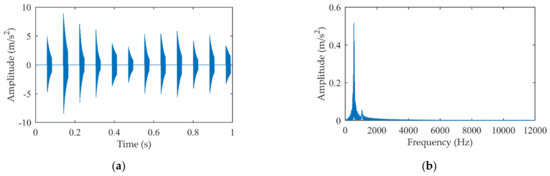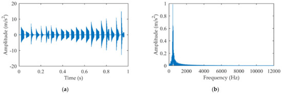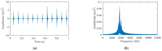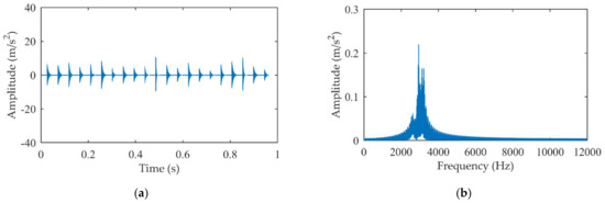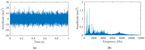 The observed acceleration signal of the single-stage gearbox experiment: (a) Time domain signal; (b) Amplitude spectrum.