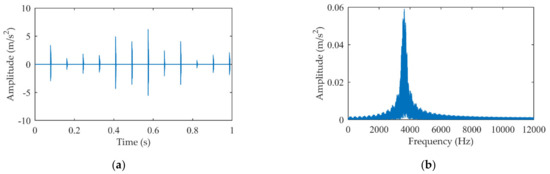 The EMD + MP is also compared with the proposed method. Specifically, the modal parameters required to impact dictionary atoms are identified from MIMF and the impact component is also extracted from the MIMF. The results are given in Figure 6. There are impact waves whose number is far exceeding the theoretical value appearing in the time domain. It is almost impossible to estimate the impact interval according to Figure 6a. Although the natural frequency band triggered by impacts is still dominant in the amplitude spectrum, the signal structure is unreasonably disassembled by EMD leading to inaccurate results.