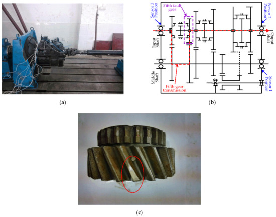The five-speed transmission test bench: (a) The five-speed transmission; (b) Drive structural diagram; (c) The local fault gear with broken tooth.