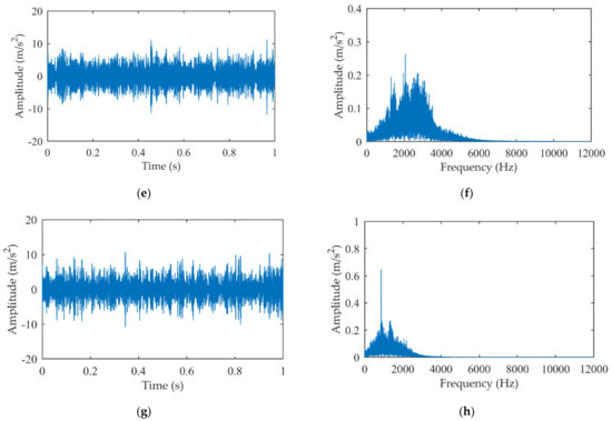 The first four IMFs of the simulation signal: (a) IMF1; (b) Amplitude spectrum of IMF1; (c) IMF2; (d) Amplitude spectrum of IMF2; (e) IMF3; (f) Amplitude spectrum of IMF3; (g) IMF4; (h) Amplitude spectrum of IMF4.