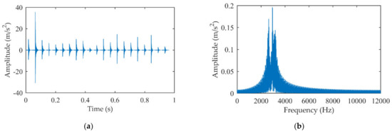 For comparison, the impact component is also extracted by traditional sparse decomposition. The results are given in Figure 11. There is a component similar to the impact waveform appearing periodically in the time domain, but these signals decay so slowly that they cannot decay to zero in each sub-segment. Moreover, the meshing harmonic components dominate in the amplitude spectrum as shown in Figure 11b. It can be observed that the modal parameters identified have large errors and makes it impossible to extract the accurate impact signal from the experimental signal.