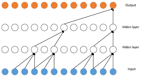 The dilation factor is introduced in dilated convolution. The dilated convolutional layers are not fully connected when linking neurons from the previous layer; only one out of every few upper layer neurons link to the next layer of neurons. For the input sequence , if the convolution kernel is , the output of the causal convolution is represented by Equation (2):