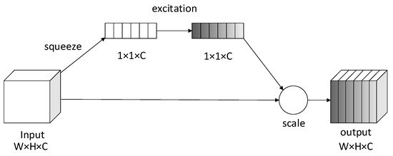The attention mechanism [29] was proposed by Bengio’s team in 2014 and has been widely applied in various areas of deep learning in recent years. The attention mechanism is excellent in machine translation tasks. Squeeze-and-excitation networks (SENet) [30], proposed in 2018, apply the attention mechanism to CNN. The SE block first performs squeeze on the feature map obtained by convolution to obtain the global features at channel level and then performs excitation on the global features to learn the relationship between each channel and also obtain the weights of different channels and, finally, multiplies the original feature map to get the final features. Essentially, the SE block performs the attention or the gating on the channel dimension. This attention mechanism allows the model to pay more attention to the most informative channel features and suppress unimportant channel features. Another point is that the SE block is generic, which means that it can be embedded into existing network architectures.
