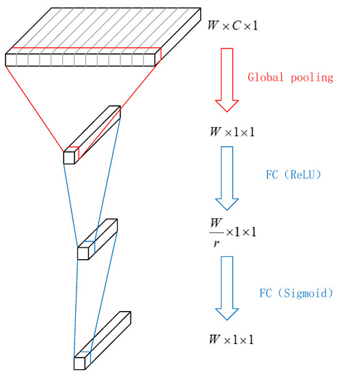 As shown in Figure 3, the SE block includes two main operations: squeeze and excitation. Squeeze is the compression of the dimensional feature map into a vector by a global averaging pooling operation along the direction of the feature channels, where the two-dimensional feature map of each channel is squeezed into a channel feature response value with a global perceptual field. The output after squeeze is obtained by Equation (4):