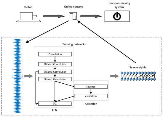 As the core part of the system, the network is our proposed TCN that incorporates attention. The input one-dimensional vibration signal sequence is first extracted with features by a conventional convolutional layer. Then, an expanded convolutional layer is used to expand the field of view and down sample. Next, the attention weights of the expanded convolutional layer are changed by SE block and linked to the following expanded convolutional layer by residuals. Finally, an output value is obtained by the full convolution layer to determine what state the motor is running in at the current time. It is worth noting that, in order to obtain the current motor operation as soon as possible, all the convolutional layers in the network are causally convolved to ensure that only the previous vibration signal is used to determine the fault condition.