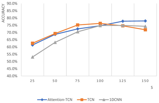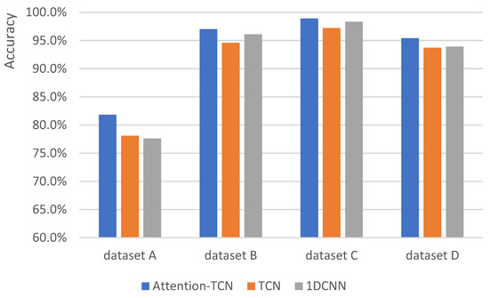 We trained the four datasets in TCN, Attention–TCN and 1DCNN several times. The average accuracy of the network on the test sets is shown in Figure 6.