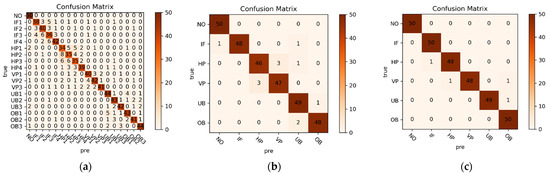The confusion matrix of the network: (a) the diagnostic results of dataset A in Attention–TCN; (b) the diagnostic results of dataset B in Attention–TCN; (c) the diagnostic results of dataset C in Attention–TCN.