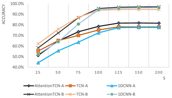 In this experiment, we observed the accuracy performance of different networks in the test set by changing the value of length of a single sample sequence for the input network . We set and then input datasets A and B into the three networks to train and test them several times. The experimental results are shown in Figure 8.