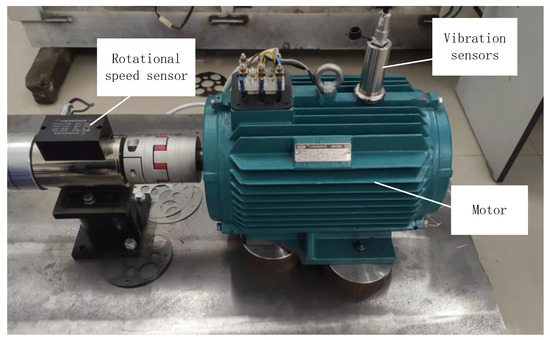 We used a special motor for the test, and the vibration sensor was mounted on top of the motor housing to collect the vibration signal in the radial direction of the motor. The vibration sensor had an acquisition frequency of 10 kHz and was connected to the computer through a microcontroller. The coupling was equipped with a speed sensor to know the real-time speed of the motor. We set two kinds of fault on the motor: imbalance faults and bearing faults. We saved and stored the trained neural network and its weights in the computer. The vibration sensor acquisition data were sent to the computer via microcontroller communication, and we set the sequence length . Whenever the computer accepted a vibration sequence of length , the sequence was fed into a neural network to calculate and obtain a diagnosis.