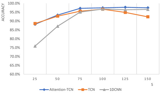 We found that, when the length of a single vibration signal sample sequence was short, it led to difficulty in extracting fault features for certain sequences. Only when the length of the sample sequence was greater than 125 could we ensure that the fault features of the original vibration signal could be extracted completely. When the length of the vibration sequence was below 75, the entire network performance degraded rapidly. However, the feature extraction ability of TCN was higher compared to CNN in the case of low sequence length. Although Attention–TCN worked better than CNN for all sequence lengths, it had lower accuracy than TCN at low sequence lengths. This also shows that, for vibration sensors of motor operation, TCN needed fewer vibration signals to make a fault diagnosis. This is significant for the real-time failure diagnosis of the motor.
