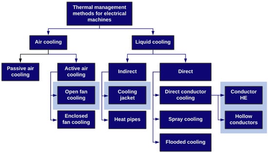 The thermal management of electrical machines is the main challenge with higher power densities due to the increased heat generated in the windings and core. Higher temperatures are detrimental to the machine’s efficiency and reliability, meaning that increases in power density are accompanied by a demand for more powerful cooling. The thermal management methods for electrical machines can be categorized into two main groups—air and liquid cooling (Figure 5). For less power-dense machines, air cooling is often sufficient, and in the case of passive air cooling, the necessary airflow is generated only by natural convection. Liquid cooling is used for more demanding applications and can be further divided into direct and indirect liquid cooling, based on the proximity of the coolant fluid to the source of heat. The most common method of liquid cooling utilizes a cooling jacket, which is a casing with coolant channels that surrounds the machine. Direct liquid cooling methods increase performance by bringing the coolant closer to the source of heat.