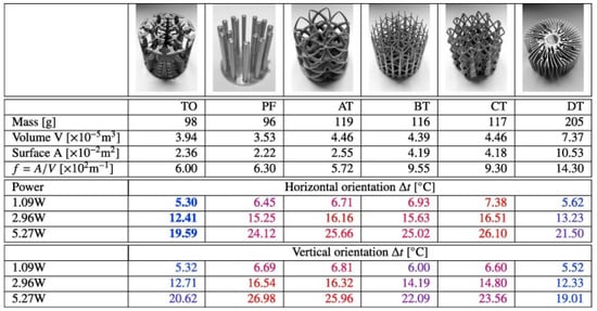Lazarov et al. [60] have used AM to create several different passive heatsinks and have compared different design ideas—TO, lattice structures, and pin fin. The heatsinks were all manufactured from an aluminum alloy, and the designs incorporate the same dimensional limitations. Out of the designs tested, the clear winner was the TO variant, which performed significantly better than any lattice structured design, even though it has a significantly smaller surface area. The difference in performance is explained by the increased airflow that the optimized design can generate through natural convection. The results of the tests are presented in Figure 6. It should be noted that the optimization was performed in a horizontal orientation. The researchers used the TO design to create a simplified and cheap to produce pin fin design, which also performed better than the lattice designs in the horizontal orientation. This research shows the benefits of TO and that simply increasing the surface area with a lattice structure is not necessarily optimal.