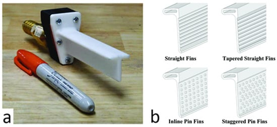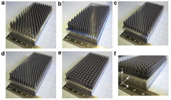 Wong et al. [69] have created several heatsinks from aluminum 6061 using SLM (Figure 8). These include two conventional designs—cylindrical pin (a), rectangular fin (b), and three novel designs—a rectangular fin array with rounded corners (c), a staggered elliptical array (d), and a lattice structure (e and f). The novel heatsink designs are only suitable for AM due to the fine detail and compact spacing of the pin fins, which would make conventional manufacturing prohibitively expensive. They investigated the thermal and fluid flow characteristics of the heatsinks and found that the elliptical pins outperformed their conventional counterparts in both heat extraction and pressure drop, as their shape creates a large surface area while keeping air resistance low. One of the worst performers was the lattice structure, which has a very large surface area but presented too large of a pressure drop to perform effectively. Even though the heatsinks investigated in this study were not fully optimized, they clearly demonstrated the performance enhancements that SLM can provide.