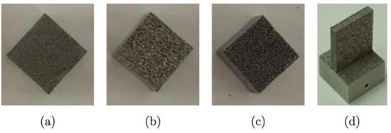 Aluminum alloy samples manufactured using DMLS with different average surface roughness: 16 µm (a), 24 µm (b), 43 µm (c), 22 µm (d) [72].