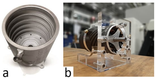 In the case where air cooling is insufficient, liquid cooling can be used to increase the thermal performance of an electrical machine. This is commonly achieved through a water jacket around the machine body, where the heat from the stator is extracted by the coolant. If the cooling jacket is separate from the stator, the contact resistance between the stator surface and the cooling channels significantly reduces thermal performance. The alternative solution is to integrate the cooling channels in the stator design, although this is difficult with conventional manufacturing methods. With an AM motor, optimized coolant paths can be freely integrated into the core, allowing for greatly improved thermal performance. AM can also improve the thermal capabilities of an existing motor by printing a separate cooling jacket with a geometry that is optimized for a specific design. Two examples of this is an aluminum cooling jacket [74] for an electric racing car which increased performance by 37% compared to the previous version (Figure 11a), and a liquid-cooled casing for an electric motor [75] which produced a 10% weight saving and a 30% reduction in size (Figure 11b).