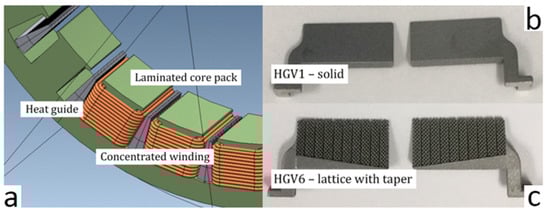 An additively manufactured solution was proposed by Wrobel et al. [92], who used SLM to create thermally conductive heat guides from an aluminum alloy (AlSi10Mg), which are designed to be placed between the windings of a motor (Figure 14a). As the heat guides are placed near the windings inside the stator slots, they assist in the heat extraction from the active part of the winding, but also contribute to the machine losses due to eddy currents induced by flux leakage. Therefore, a solid heat guide provides negligible performance improvements, but AM enables the production of different lattice structures (Figure 14b,c) which emulate traditional laminations, and thus, it is possible to eliminate most of the extra losses while keeping a high thermal conductivity. Using a heat guide made with lattice structures, they achieved a 55% increased total thermal conductivity from the winding body of a test motorette without significant extra power losses.