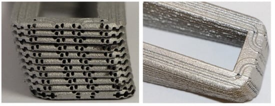 Although adding a surface pattern might not be necessary, as the additively manufactured metal has inherently rough surfaces that can be beneficial for cooling (Figure 10). Ventola et al. [72] have measured parts manufactured by direct metal laser sintering and found an up to 73% increase in cooling performance over similar smooth parts. The authors explain that as these results are not explained by the increased surface area due to the roughness, the performance must be caused by turbulent flows created by the multi-scale roughness. They suggest a novel method of modelling this effect, which is in excellent agreement with their measured results. As tools to optimize surface roughness become available, designers of additively manufactured machines may start to use them to vary the printing parameters in certain parts of the machine to achieve optimal cooling performance. The effects of surface roughness were also studied by Kirsch et al. [73], who created several microchannel pin fin arrays using L-PBF. It was found that the surface roughness of pins can be beneficial by exacerbating pin wake interactions. The authors also noted that pin spacing could be increased without sacrificing thermal performance, meaning that the weight and material costs of heat exchangers could be decreased with the use of AM.