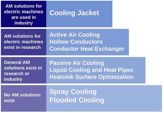 Various cooling methods for electrical machines. The light blue shading indicates that an additively manufactured solution for an electrical machine exists in the literature.