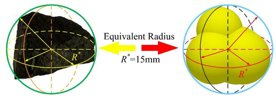Spherical particles are popular in the DEM due to their uncomplicated shape and high computational efficiency. However, particle motion is affected by rolling friction and sliding friction, which leads to problems as the spherical particle uses point contact. Therefore, the results with spherical particles tend to have a large rate of error, while coal particles excavated from the coal wall are not regular balls in actual working conditions. Referring to References [35,36], on the premise of ensuring the accuracy of the modeling results, the coal particle is filled in the DEM to a pyramid shape based on coal bulk excavated by a thin coal shearer, and the equivalent radius is 15 mm, as shown in Figure 2.