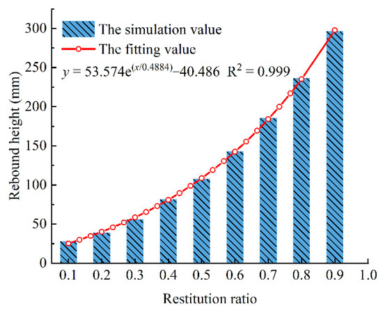With the increase in RC, the energy dissipated in the collision between coal and steel decreased, which can be seen in Figure 4. A larger RC will lead to more bounces and a larger H1. The relationship between the RC and H1 is shown in Figure 5, and the exponential function can be used to describe the relationship between RC and H1. However, the coal particle shape is irregular, and breakage will occur during the collision; these factors have an impact on the measurement results. Hence, referring to Reference [38] and combining the measurement results, the RC was determined to be 0.5 in this study, based on Figure 5.