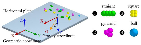 Four typical coal particle shapes were selected in the DEM to calibrate the rolling and particle–wall sliding friction using the sliding test, as seen in Figure 6. Ball particles were selected to calibrate the rolling friction coefficient, pyramid and straight particles were selected to calibrate the rolling and sliding friction coefficient and square particles were selected to calibrate the sliding friction coefficient. The numbers of the four particle types ranged from 3 to 5, and all the particles were statically located on the horizontal steel plate. The critical rolling and static friction coefficient can be obtained by changing the gravity values in the X and Z directions of the XOZ plane. Compared with the experimental results in References [37,38], the particle–wall rolling and static friction coefficient can be obtained in the DEM.
