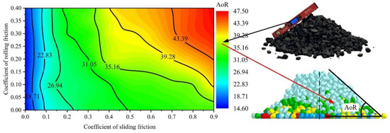 The AoR test is a common method for calibrating the particle–particle friction coefficient [36]. The AoR experiments were performed repeatedly with uniform-size coal particles, which were excavated by a thin coal shearer, and the average experimental repose angle is 37.8°. In the DEM, the numerical AoR tests were performed with pyramid particles, and the numerical AoR of a combination of sliding and rolling friction, which was consistent with experimental results, was obtained and can be observed in Figure 7. The sliding and rolling frictions were 0.80 and 0.10, respectively.