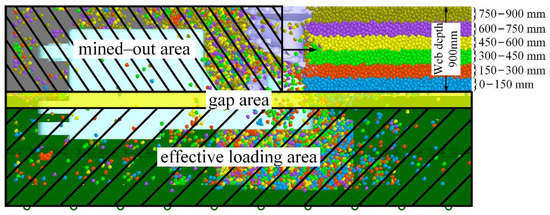 To investigate the drum’s loading performance, the distribution region of particles was divided into three areas: the drum track, namely the mined-out area whose width is equal to the drum width; the efficiency loading area, which is the groove of the chain conveyor and the gap area, which is the gap between the chain conveyor and coal wall, with a width of 100 mm. The loading rate is defined as the ratio of particle number in the effective loading area and the total number of particles excavated by the drum, which can directly reflect the drum’s loading performance. The division of the statistical area is shown in Figure 8. In addition, to study the conveying performance of the drum on particles with different web depths, the coal wall was evenly divided into six sections, and the width of each section was around 150 mm.