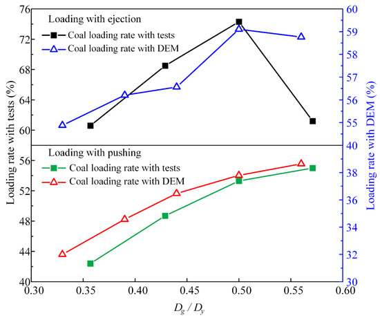 It can be seen from Figure 11 that, under ejection and pushing conditions, the changing trend of the loading rate with the ratio of the barrel diameter to blade diameter (Dg/Dy) was consistent in the DEM and tests. The loading rate in tests was notably higher than that in the DEM under both conditions because the ranging arm in simulations hindered the movement of particle flow. Another reason for this result is that the distribution zones of particles in the tests were only divided into two parts, without the gap area that exists in the DEM. Therefore, it can be deduced that the developed model can reproduce the loading process using a drum, and the investigation of the effect of barrel diameter on loading performance and particle motion behavior was subsequently performed based on the DEM model.
