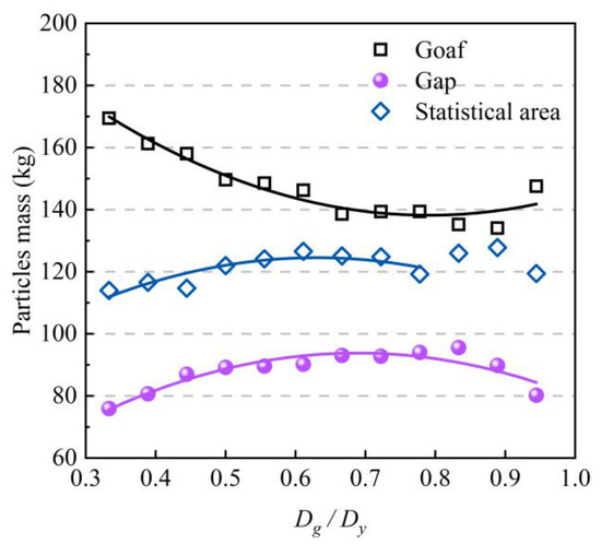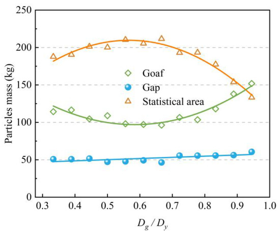 The distribution results of particles in different areas are shown in Figure 12. The barrel diameter has a significant effect on particle distribution in the goaf and conveyor but has no obvious impact on the gap. In addition, the barrel diameter has the opposite effect on the distribution of particles in the goaf and conveyor: with the increase in barrel diameter, the particle mass in the goaf first increases and then decreases, and the particle mass in the first goaf decreases and then increases. It should be noted that the particle mass in the goaf and conveyor increases with barrel diameter when the barrel diameter is small, and the changing range is under 25 kg; when the barrel diameter increases to 700 mm (Dg/Dy = 0.78), a notable increment and decrement in particle mass can be observed in the goaf and conveyor, respectively, and the changing range is more than 70 kg. With the increase in barrel diameter, the particle mass in the gap increases slightly, but this is discontinuous, which proves that there is no obvious regularity between the distribution of particles in the gap and barrel diameter.