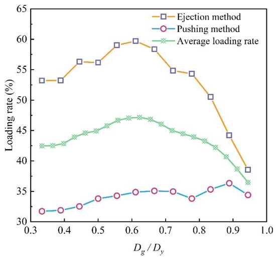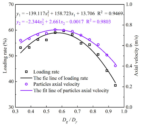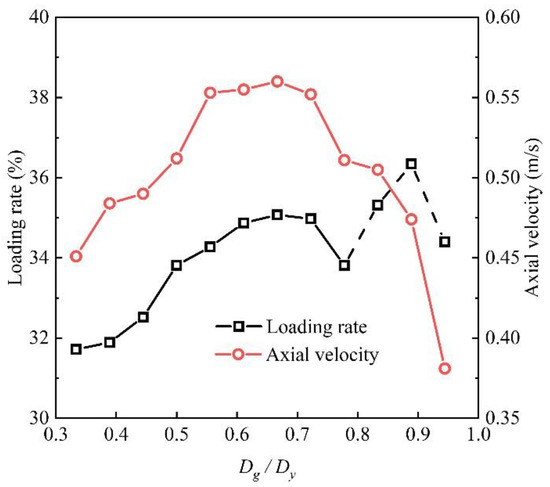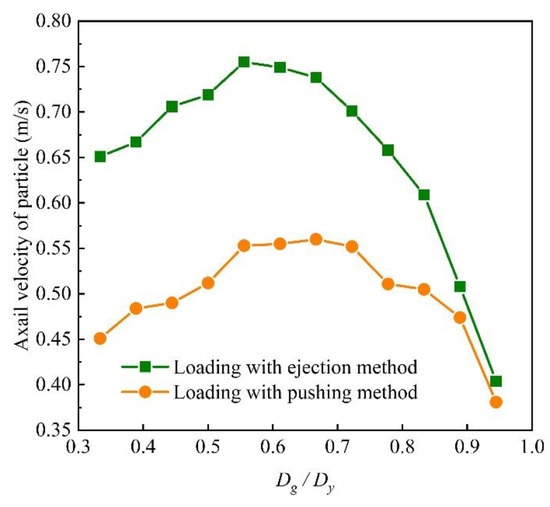 The relationship between the coal-loading rate and particles’ axial velocities with barrel diameter with pushing is shown in Figure 17. This can be described by a quadratic function: they first increase and then decrease with the increase in barrel diameter. When the Dg/Dy is 0.78, namely the barrel diameter is 700 mm, the changing trend of the loading rate is not consistent with the particles’ axial velocities. As with the ejection mode, the particles’ axial velocities continuously decrease with the increase in barrel diameter when the ratio of Dg/Dy exceeds 0.78, while the loading rate increases and then decreases, obtaining a peak with the 800 mm barrel diameter. The phenomenon is consistent with the above discussions, showing that the increment in barrel diameter causes more particles to cross the gap area onto the conveyor, leading the coal-loading rate to increase again.