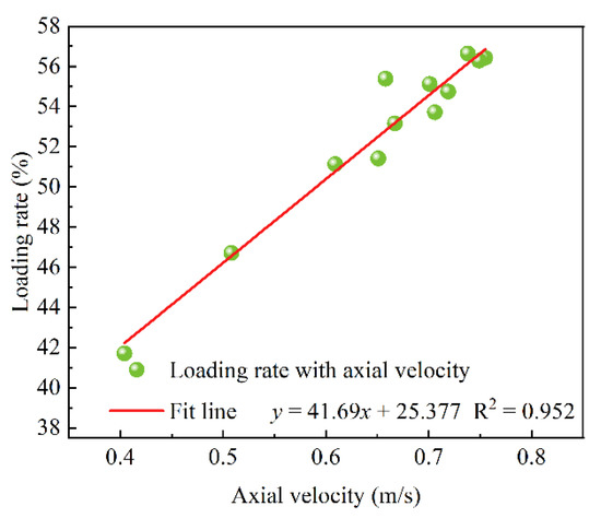 Figure 14 demonstrates that a linear function can be used to describe the relationship between coal-loading rate and particles’ axial velocities, where the loading rate increases with the increase in particles’ axial velocities, which is consistent with the deduction and explains the similar changing trends of particles’ axial velocities and loading rate with barrel diameter.
