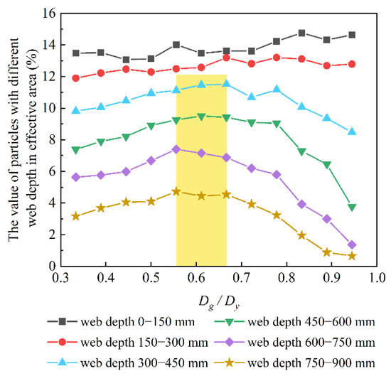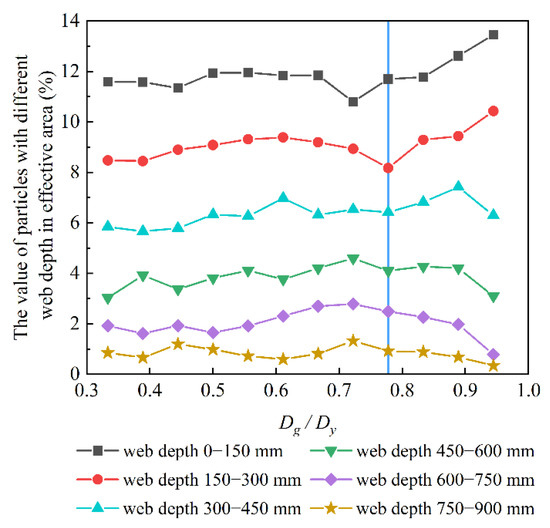 From the comparison with Figure 15, the proportion of particles with a web depth of 600–750 mm significantly changed, which means that the loading effect of particles in this web depth is sensitive to the barrel diameter. This was followed by web depths of 450–600, 750–900 and 300–450 mm, and the particles with a web depth under 300 mm were hardly affected by barrel diameter. It can be understood that the loading rate of particles with a web depth greater than 450 mm has an important impact on the drum’s loading performance. Therefore, increasing the barrel diameter to a certain extent can effectively improve the loading rate of particles with a large web depth and further improve the drum’s loading performance.