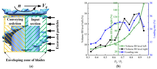 It can be seen from Figure 18a that the drum is evenly divided into two halves: the half close to the coal wall is the input section (right section), and the other is the conveying section (left section). It can be observed that the filling rate of the input half is greater than that of the conveying half in Figure 18b, due to the particles being excavated from the coal wall and accumulated in this half. Considering that the conveying capacity of the drum is constant for the changeless hauling and rotary speed, as the barrel diameter continuously increases, the space of the enveloping zone decreases, and the filling rate on the input half increases. Moreover, the change rules of the loading rate and filling rate on the conveying half with the barrel diameter are almost the same, especially when the barrel diameter is greater than 700 mm, which proves that the filling rate on the conveying half of the drum has an important impact on the loading rate. The results fully prove that the above inference is correct. According to the analysis of Figure 17 and Figure 18b, when the barrel diameter is small, the main factor affecting the coal-loading performance of the drum is the particle axial velocities; when the barrel diameter continuously increases, the filling rate of particles inside the drum begins to play an important role.