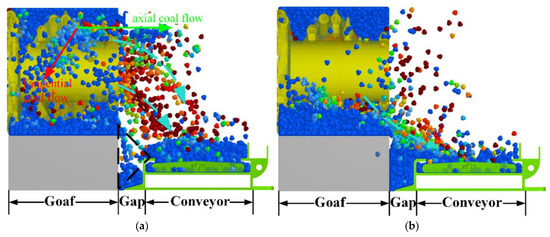 (3) The influence mechanism of a barrel diameter with ejection and pushing is different. The axial velocity and loading rate of particles with ejection are greater than those with pushing, especially when the barrel diameter is small. Compared with the pushing mode, the coal-loading rate with ejection is increased by about 25%, and the axial velocity of particles is increased by about 50%. The difference in coal-loading rate between ejection and pushing is mainly affected by the particle loading rate within the web depth of 300–600 mm, and the loading mode has no obvious effect on the particle loading rate at the end plate and near the conveyor. The effect of barrel diameter on drum loading rate is more obvious using ejection but not pushing mode.