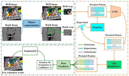 The algorithm framework proposed in this paper is shown in Figure 1, and it consists of three main parts. Among them, the first part is the semantic segmentation of RGB images. Obtain the bounding box of the target object and crop it, get only the color map and depth map of the target object, and convert the depth map into a point cloud. The second part is the feature extraction structure. Firstly, the PointNet network is used for the feature extraction of the object point clouds, and then the point cloud features are stitched at the pixel level as information that is geometrically complementary to the RGB images. The stitched images are then inputted into CNN for feature extraction. After that, the obtained color features are combined point by point as the color complementary information of the point cloud. Then the improved PointNet++ network is used for feature extraction of the combined point cloud. Finally, a set of centroid features fused by pixel features, area features, and global features are obtained. In the third part, the poses are estimated for each centroid feature and the poses with the highest confidence are the output. Finally, we refer to the pose iterative module in [28] to improve the accuracy of pose estimation.