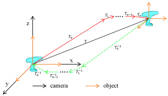 The principle of pose optimization is shown in Figure 5. The real pose of the object in the camera coordinate system is T = [R, t], the predicted pose is and the pose difference is set to ΔT = [ΔR, Δt]. After n iterations, the final predicted pose of the whole pose estimation network is: