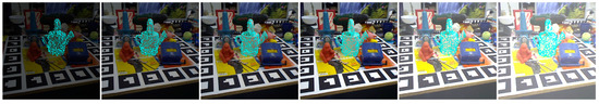 The RGBD camera captures images under dark or strong light conditions, which only affects the RGB image and does not affect the depth image. Therefore, in the same scene, we change the luminance value of the RGB image to verify the robustness of the method proposed in this paper under illumination. Figure 8 shows the pose estimation results of our method under the condition of illumination change. It can be seen that our method fuses the features of RGB image and depth image, which can better solve the problem of pose estimation under the condition of illumination change.