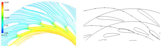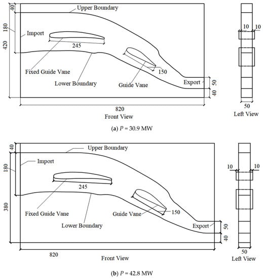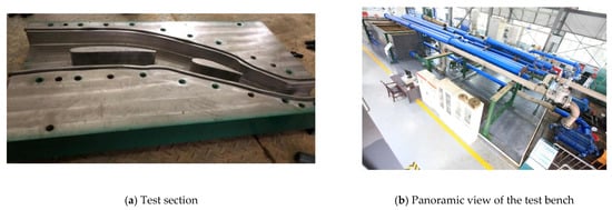 Regarding the design of a mixed-flow hydraulic turbine test stand, a one-to-one replication according to the real model of the power station would waste a lot of time and financial resources, so many scholars are proposing a simple test stand design concept when designing a test stand for over-flow components [17,18]. In this paper, based on the structure and flow of the hydraulic turbine guide mechanism of the real machine, the sediment wear test of its hydraulic turbine guide vane is carried out. Firstly, CFD full-flow channel sand and water numerical calculation of the real turbine is carried out [19,20], and then two flow channels containing complete movable and fixed guide vanes are extracted according to the full-flow channel numerical simulation results, and the sand and water flow lines of the outer side walls of the flow channels contain the adjacent movable and fixed guide vanes side walls, and a single test working section around the flow channel is designed according to the flow similarity principle in line with the actual flow to ensure the simulation of the real turbine. This is done in order to ensure the simulation of the environment of the movable guide vane and fixed guide vane working in the flow channel of the real hydraulic turbine.