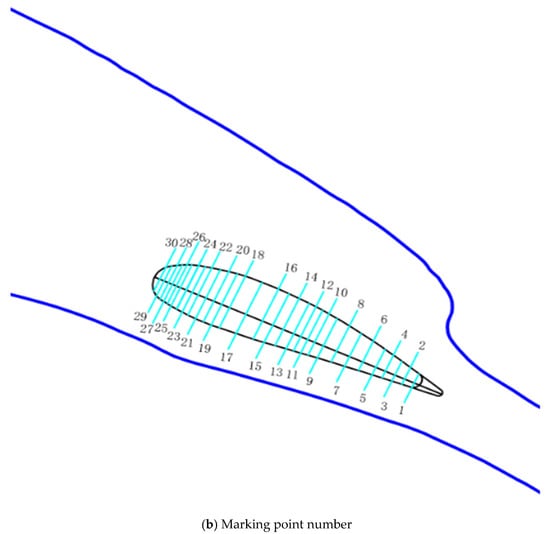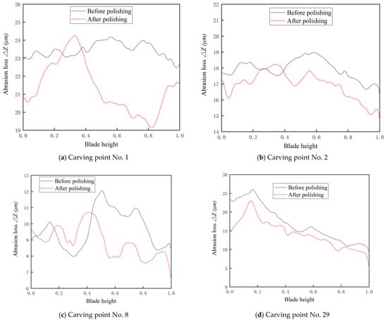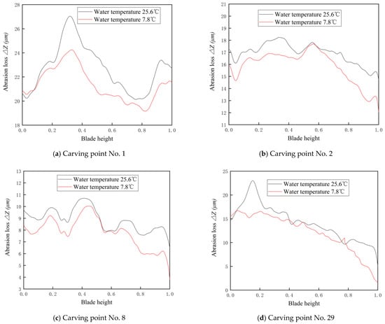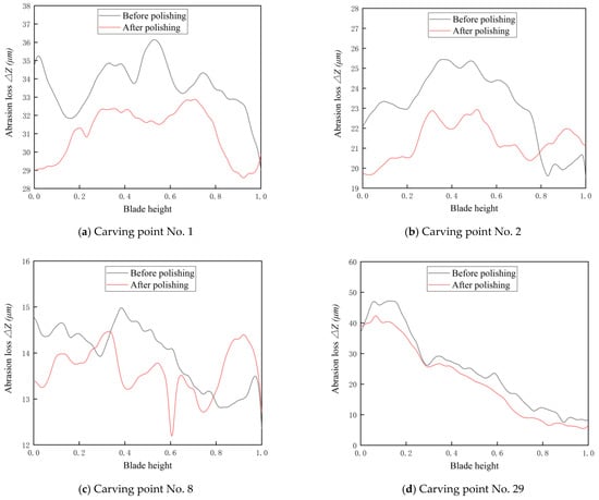 In this paper, tungsten carbide (HV = 1264) powder with a thickness of 0.3 mm was thermally sprayed on the guide vane surface to enhance its anti-wear performance. The wear amounts of different leaf heights at inscribed points 1, 2, 8, and 29 were obtained based on the measurements after the test, as shown in Figure 18. According to Figure 18, the wear of the guide vane after spraying tungsten carbide is significantly reduced at different leaf heights, and the wear difference at different leaf heights is reduced compared with that before spraying, which shows that the fatigue resistance of tungsten carbide material is much greater than that of ZG06Cr13Ni4Mo. The guide vane time after spraying was measured by weighing, and the results are shown in Table 5. From Table 5, it can be seen that the guide vane wear is significantly reduced after tungsten carbide spraying, which is three to four times of the role before spraying.