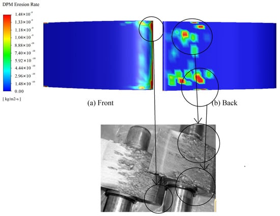 (a–d) Wear on the surface of guide vane (P = 30.9 MW).