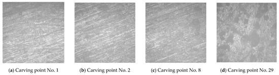 In order to verify the effect of the surface roughness of the guide vane on sediment wear, the wear amount of 1, 2, 8 and 29 engraved points on the back of the guide vane at different vane heights were obtained according to the test results. The wear amount of the guide vane with two different roughnesses under P = 30.9 MW working conditions is taken for comparative analysis. In addition, the wear amount of the guide vane with two different roughnesses under the P = 42.8 MW working condition is taken for comparative analysis of different working conditions. In order to reduce the measurement error and ensure the accuracy of the test data, five measurements were repeated for each inscribed point, and the average data of the five measurements was taken as the final result, and the confidence level of the measurement results was 97%. The wear data of the four inscribed points under two working conditions are shown in Figure 13 and Figure 14. From Figure 13 and Figure 14, it can be seen that the wear at the guide vane is more serious at the No. 1 and No. 29 points, and the wear at the low leaf height at the No. 29 point is more serious, which may be because the sediment with larger particle size has poor flowability and it is easy to form deposits at the low leaf height, and the sediment particles have a larger impact angle at the No. 29 point, resulting in more serious wear; the wear at the different leaf heights at the No. 1 point is more moderate, which may be due to the fact that when the sand and water flowed through the No. 1 point, the sediment with a large particle size was deposited at the bottom of the flow channel, while the sediment with small particles would follow the flow of water to scour the tail position of the guide vane because of the strong flowing nature, and the tail position had a small collision angle with the sediment particles, so the wear at the different leaf heights at the No. 1 point tended to be gentle and did not have much difference. The wear amount at the No. 2 engraved point and No. 8 engraved point is flatter, but the wear amount is lower, which is due to the influence of sand and water velocity, as the flow channel becomes narrower, the sand and water velocity becomes larger, the kinetic energy contained in the sediment particles increases, and the wear amount increases gradually. In addition, the surface wear forms of the inscribed points 1, 2, 8, and 29 at 50% of leaf height were photographed, as shown in Figure 15 and Figure 16, and the 50% leaf height was chosen considering the effect of the sidewall effect [27,28]. According to the results in Figure 15 and Figure 16, it can be further verified that the wear at the head position is mainly large particle sediment impact wear, and the wear at the tail position is mainly sand level shift scouring. Comparing the wear of the guide vane under the two operating conditions, it can be seen that the wear curves of the four points at different leaf heights tend to be similar, with the wear of the No. 1 and No. 2 points being higher at the middle leaf height and lower at the low and high leaf heights; the wear of the No. 8 point at different leaf heights varies smoothly without excessive or low wear; the wear of the No. 29 point gradually decreases from the low to the high leaf height. At P = 42.8 MW, the wear amount of all four points is larger than that at P = 30.9 MW, which is due to the increase of water velocity caused by the increased inlet flow, which further aggravates the sediment wear.