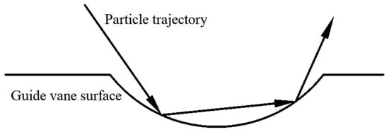 The surface of the guide vane before grinding and polishing will have a lot of small uneven pits, the large particle size of the sediment particles hitting these pits will make the area of the pits increase, and the small particle size of the sediment particles will form refraction inside the pits causing secondary or even multiple collision wear, although the secondary collision is smaller compared to the first collision kinetic energy, but due to the pushing effect of the water will give the sediment particles new kinetic energy, intensifying the surface wear of the guide vane, as shown in Figure 17. In addition, the larger the particle size of the potential energy contained in the larger the more likely to cause sand-water separation, while causing greater sources of interference, will produce additional turbulent eddy, while the formation of more sand particles and guide vane surface collision refraction will affect the flow of water flow patterns; it is easy to achieve the grinding and polishing shown in the carved point 8 before the amount of wear in some leaves high than before grinding and polishing, of course, this in the guide vane head position (1, 2 near the engraved point) is less affected. From Figure 15 and Figure 16, it can be seen that there are many pits of different sizes in the head position of the guide vane which are formed by the impact wear, and the different sizes of the pits may be due to the collision of large grain size sand particles to expand the pits with smaller areas, and then the sediment with small grain size continuously collides inside the pits to increase the wear depth of the pits, and the area of the pits formed at P = 42.8 MW is larger. Because the flow rate becomes larger, the kinetic energy and potential energy of sand particles increases, and the wear caused is more serious. Obvious sand and water scouring marks appear at the tail position. In order to further understand the influence of the surface roughness of the guide vane on the wear, the guide vane specimens before and after the wear were weighed to obtain their specific wear amount, as shown in Table 3. As can be seen from Table 3, the polished guide vane is less eroded by sediment abrasion.