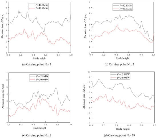 (a–d) Wear amount at different scoring points (P = 42.8 MW).