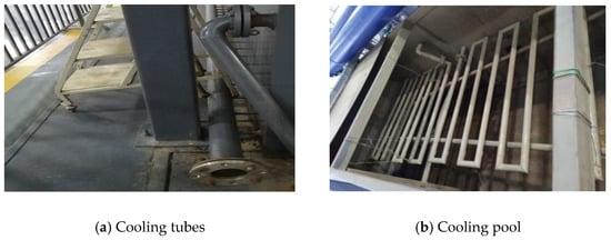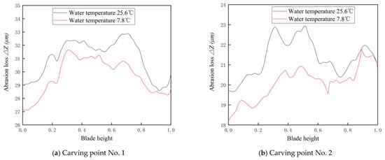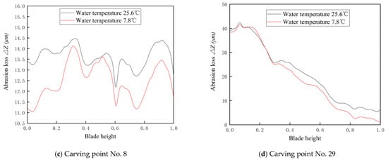 In order to make the test similar to the actual power station, the water temperature is controlled to simulate the wear of the guide vane during the dry and flood periods of the power station. The average temperature of the river where the power station is located is generally 24–27 °C in summer and 4–8 °C in winter. Because the temperature of the water body will affect the change of dissolved oxygen in the water, so it can also be used as the basis of the effect of the water body’s dissolved oxygen on the wear of guide vane. The water used for the test is tap water, and its average temperature is 25.6 °C, which can be used to simulate the wear of the guide vane in the summer. The test bench is equipped with a cooling system which can cool the winding water body to meet the winter water temperature standard, and the cooling system is shown in Figure 19. The wear data of the guide vane under two different working conditions after polishing are obtained according to the test, as shown in Figure 20 and Figure 21. It can be seen in Figure 20 and Figure 21 that there is a significant effect in the temperature on the wear amount of the guide vane. Comparing the two test water temperatures, the wear of the guide vane at different leaf heights at a water temperature of 7.8 °C is lower than that at a water temperature of 25.6 °C. However, comparing the wear trends of different leaf heights in the two groups of water temperatures, it can be seen that the change of water temperature does not affect the wear pattern of the guide vane at different leaf heights.